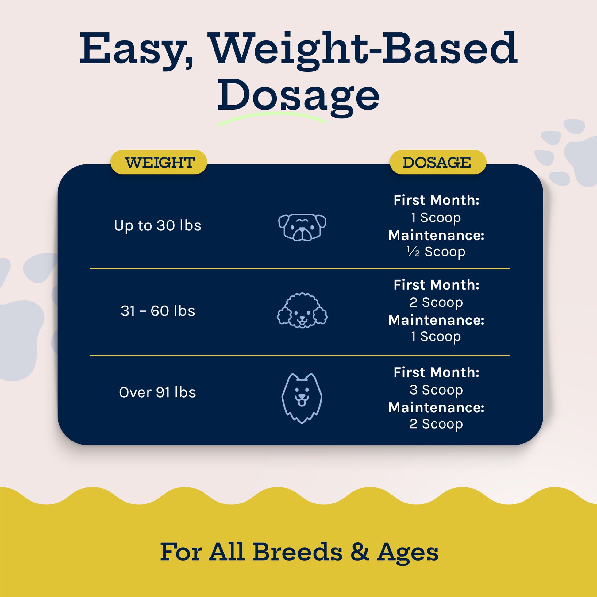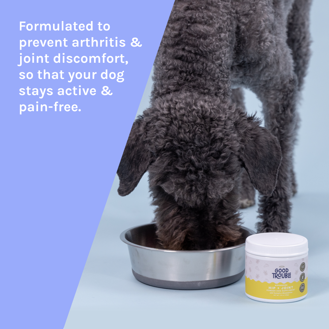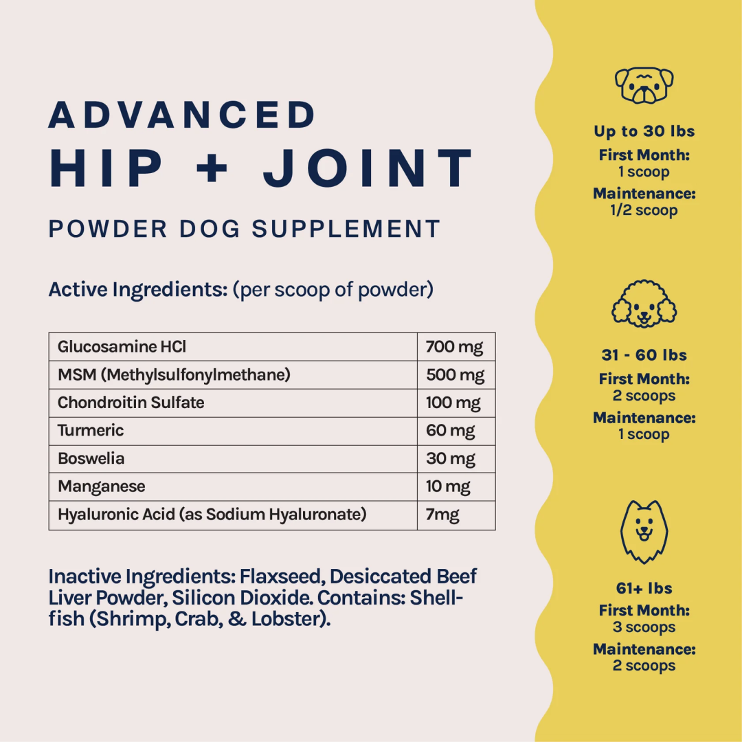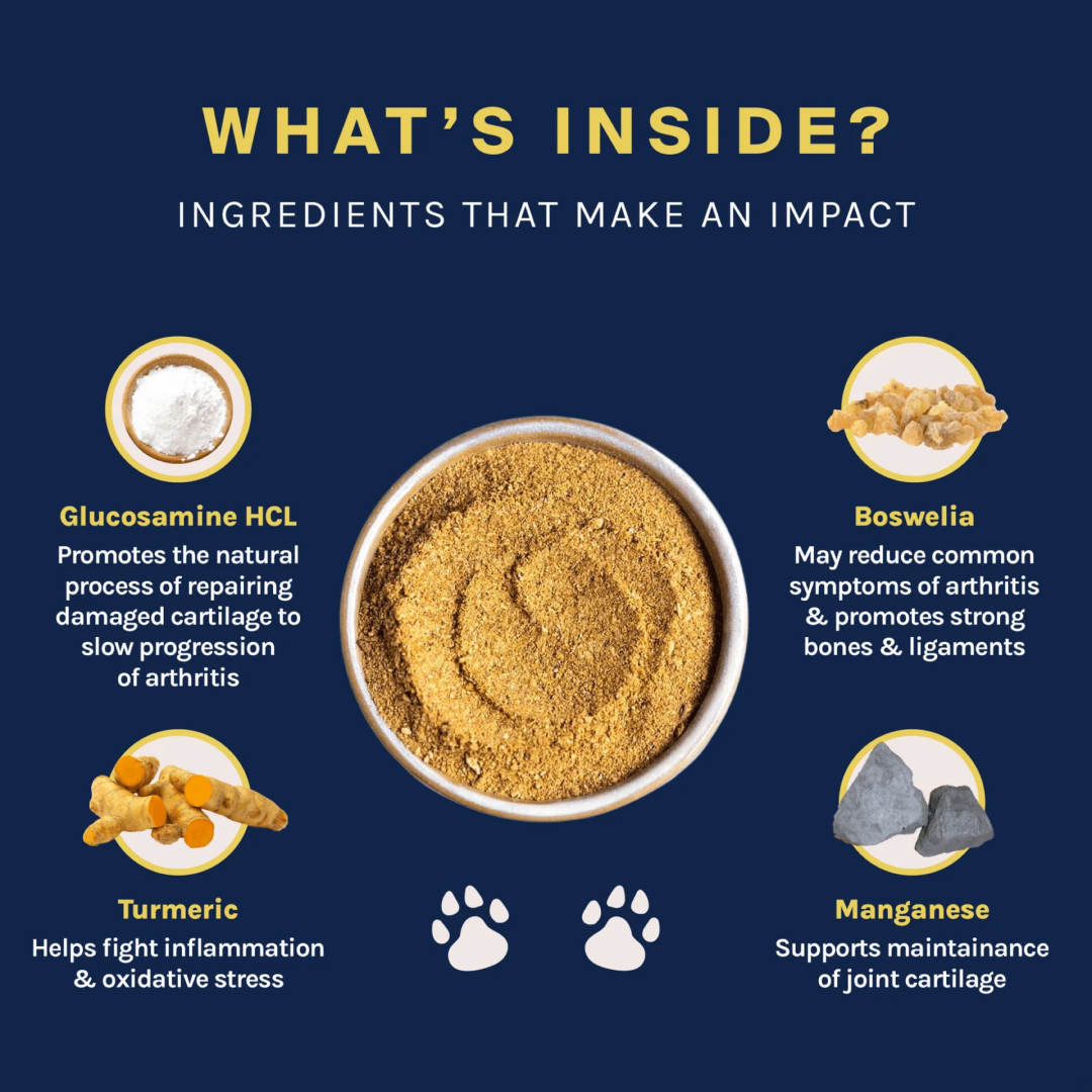 Keep your pup moving with our Hip + Joint Powder, designed to support healthy joints and mobility so they can stay active and pain-free.- No fillers or grains