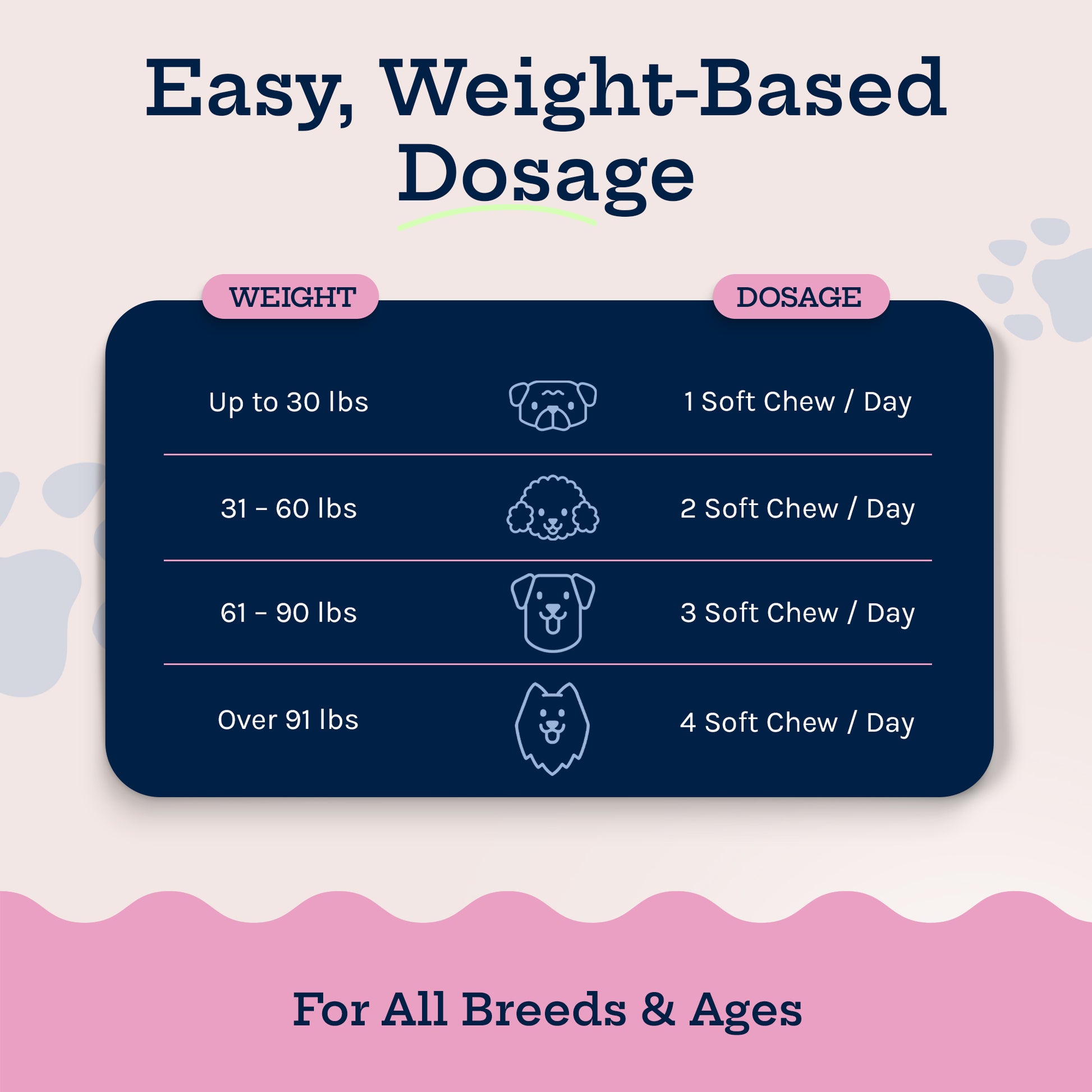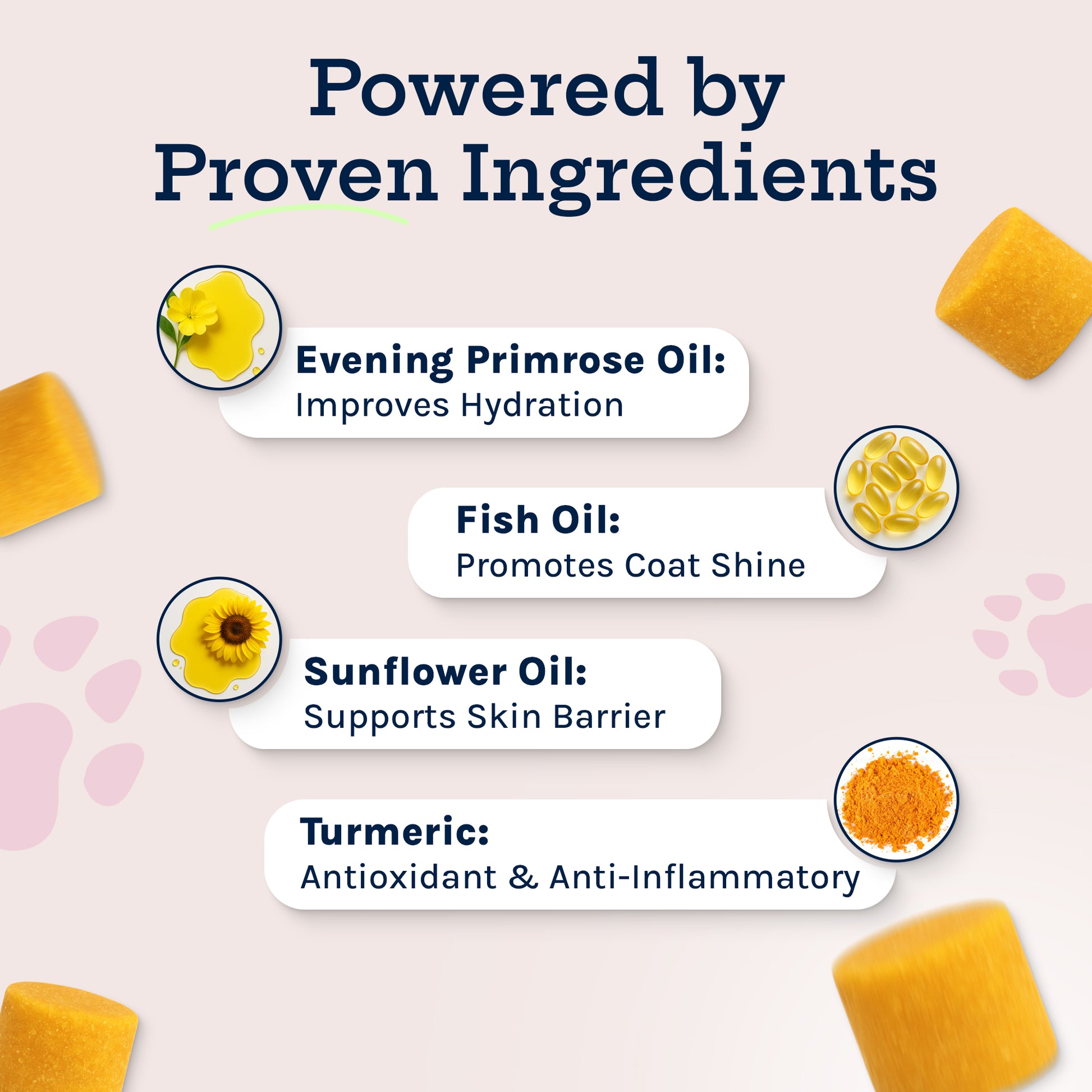 Give your dog’s coat the shine it deserves and their skin the care it needs. Our soft chews are packed with nutrients that promote a glossy coat and healthy skin from the inside out.- Premium Human-Grade Ingredients