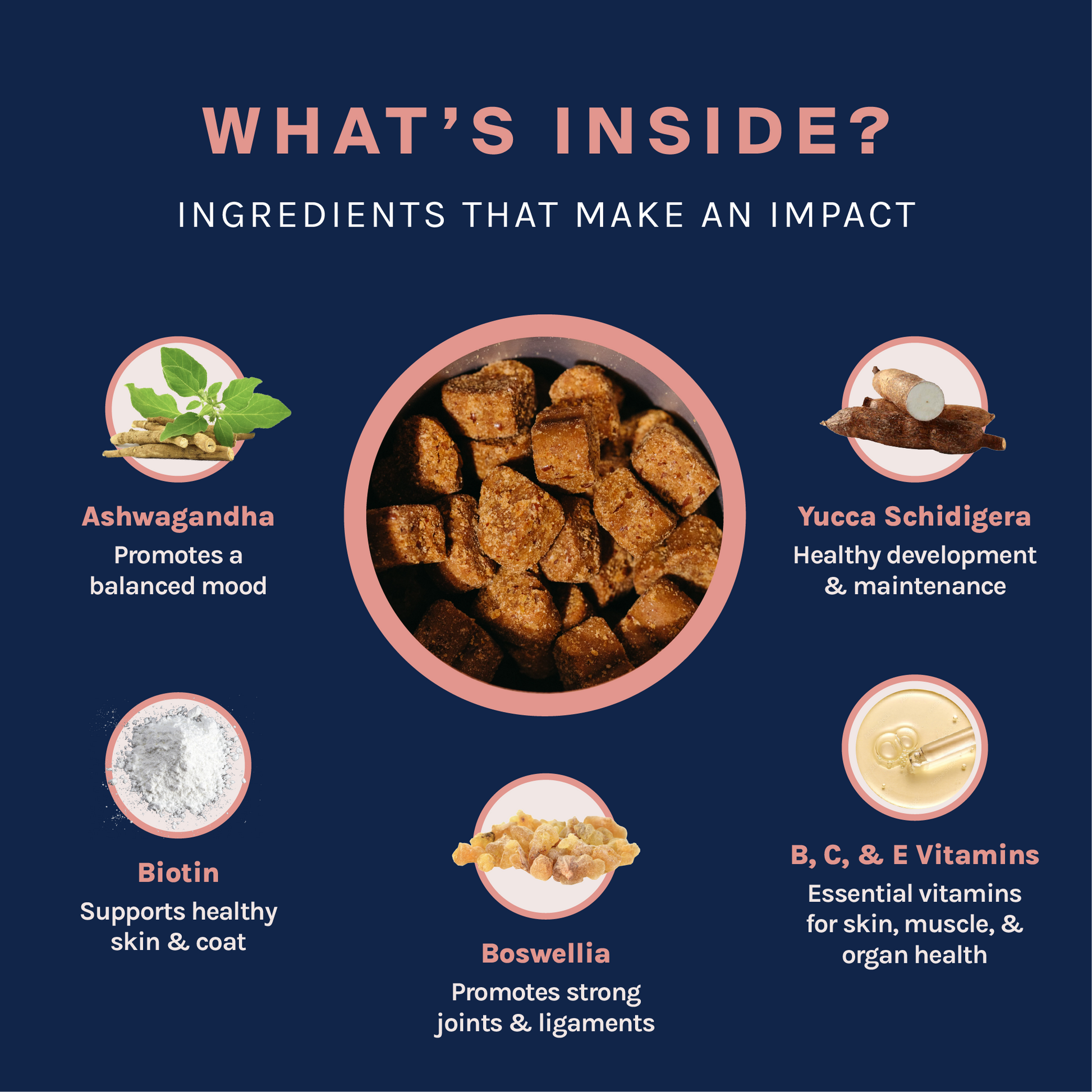 Packed with powerhouse ingredients like Ashwagandha, Biotin, Vitamins B C & E, and Yucca Schidigera, this complete multivitamin promotes joint health, vibrant skin & coat, and overall vitality, ensuring your furry friend thrives every day.