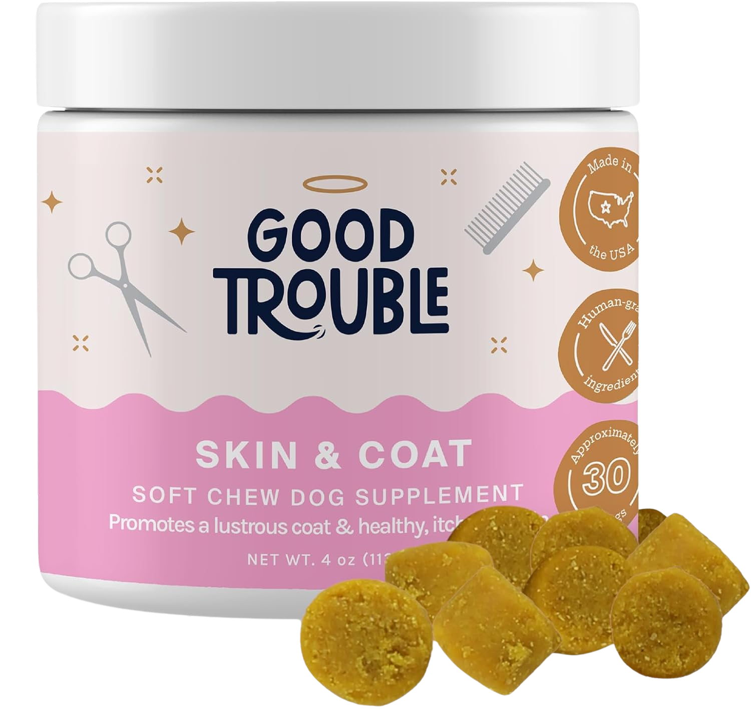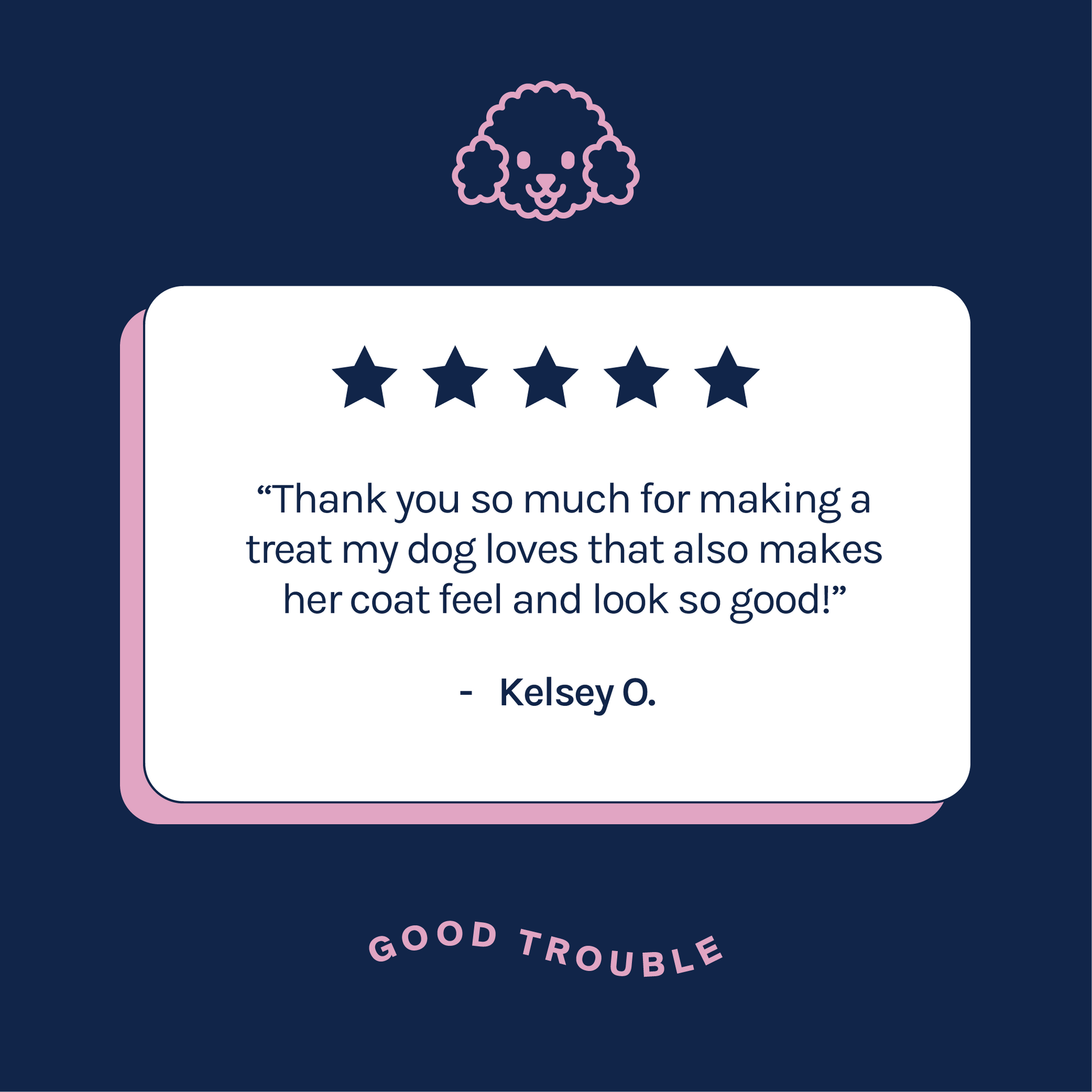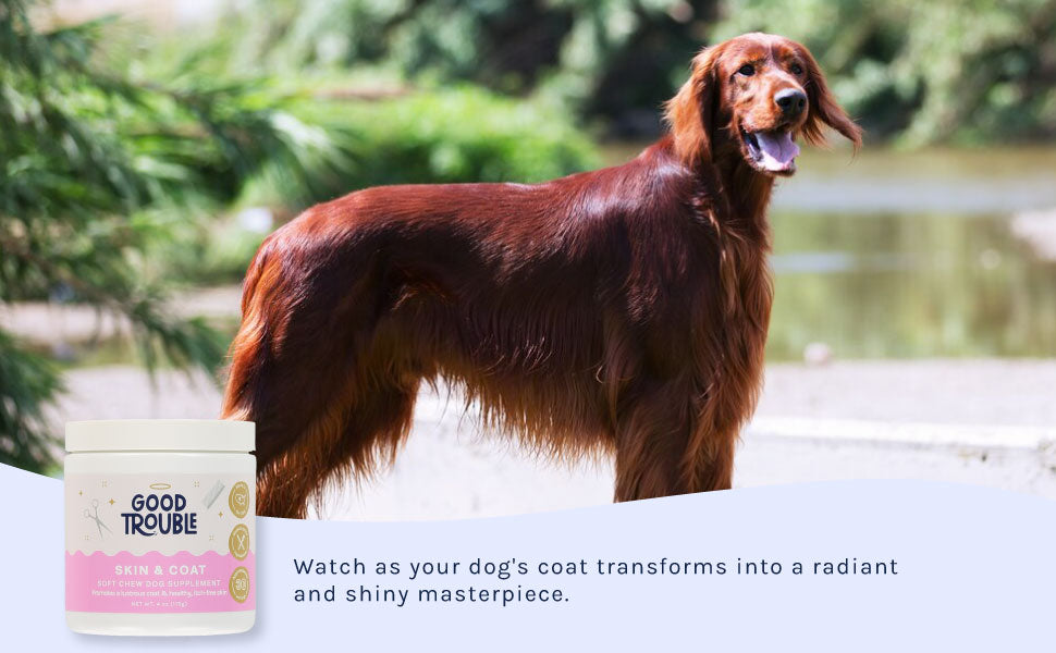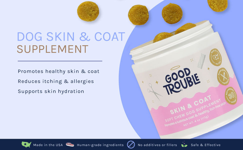 Help your dog achieve a healthy and shiny coat with our soft chew supplement. Made with human-grade ingredients including Vitamin E, Fish Oil, and Turmeric, this delicious treat can be given daily for best results.
